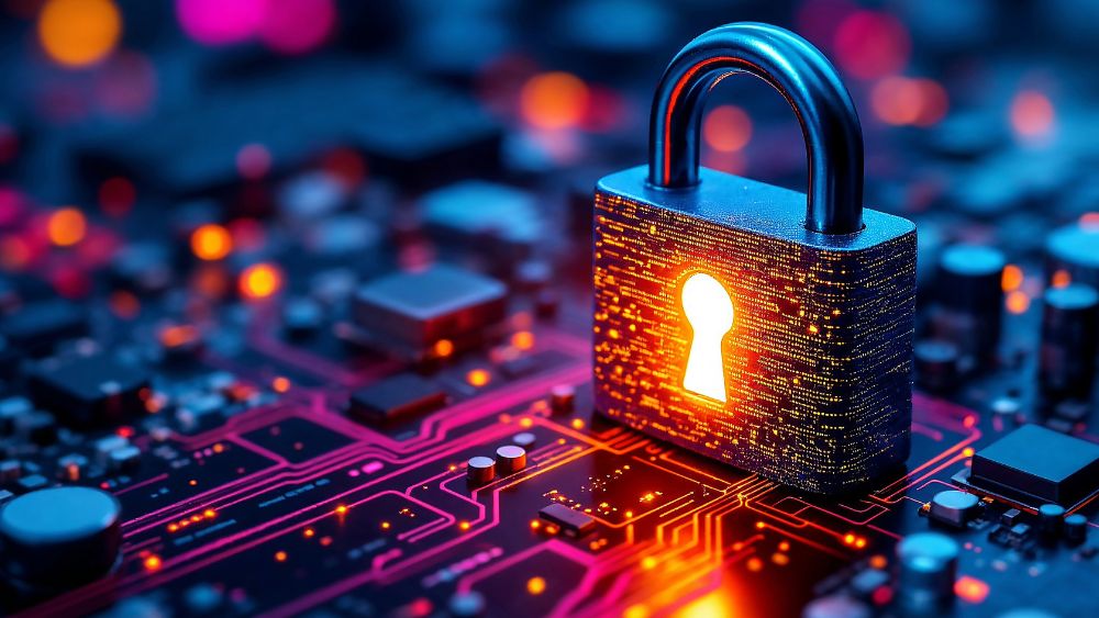 Digital padlock on a circuit board with various pink, orange, and green lights flashing