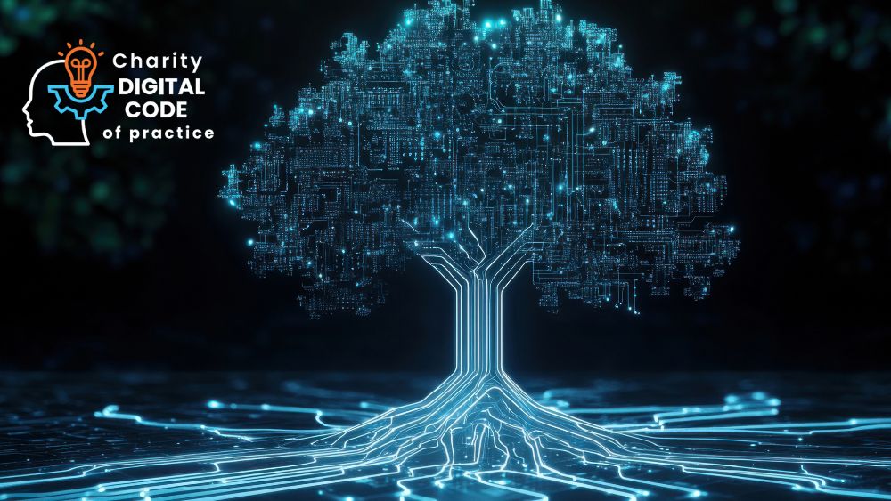 A digitally-rendered tree in binary white code against a navy background with the 'Charity Digital Code of Practice' logo to its left